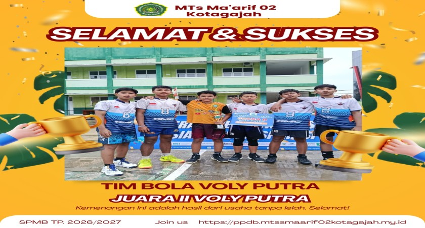 Kotagajah – Kabar membanggakan kembali datang dari tim olahraga MTs Ma'arif 02 Kotagajah. Tim Bola Voli Putra berhasil menorehkan prestasi gemilang dengan meraih Juara II dalam ajang turnamen bola voli yang diselenggarakan pada acara Gebyar Milad ke-30 SMK Muhammadiyah Tumijajar.